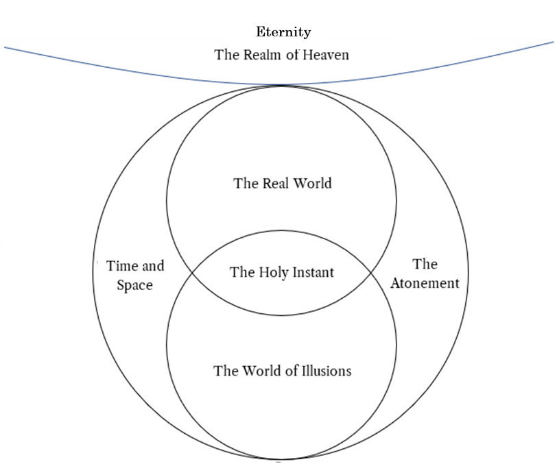Per the diagram above, the Atonement, which undoes all illusions including the belief in time and space, encompasses both the world of illusions, where It is needed, and the real world, where It has been received. The transition between the world of illusions and the real world is in the current moment, which when Atonement is applied to it becomes the Holy Instant—the Presence of Love.