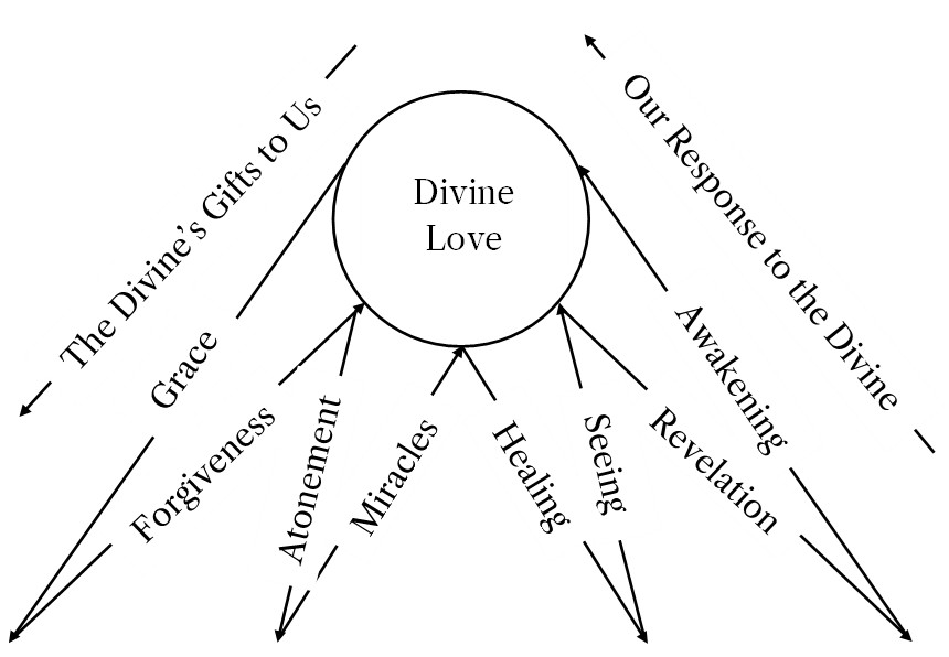 To summarize (per the diagram below), we know that we’re in the world of illusions whenever we’re not experiencing the Presence of Divine Love, because not to experience this Presence is an illusion, since It is everywhere. This Presence is experienced as Grace. When we respond to Grace by extending the forgiveness we have received from It to ourselves and to all our sisters and brothers, we set Atonement into motion in the moment. Miracles will flow from Atonement being set into motion in the moment. Miracles always lead to healing, and as our minds are healed we eventually learn to see. Revelation can come at any moment from the Bringer of Revelation, the Holy Spirit. When our minds are fully healed and we have returned completely to our original form of Communication with the Divine through revelation, our awakening is complete.